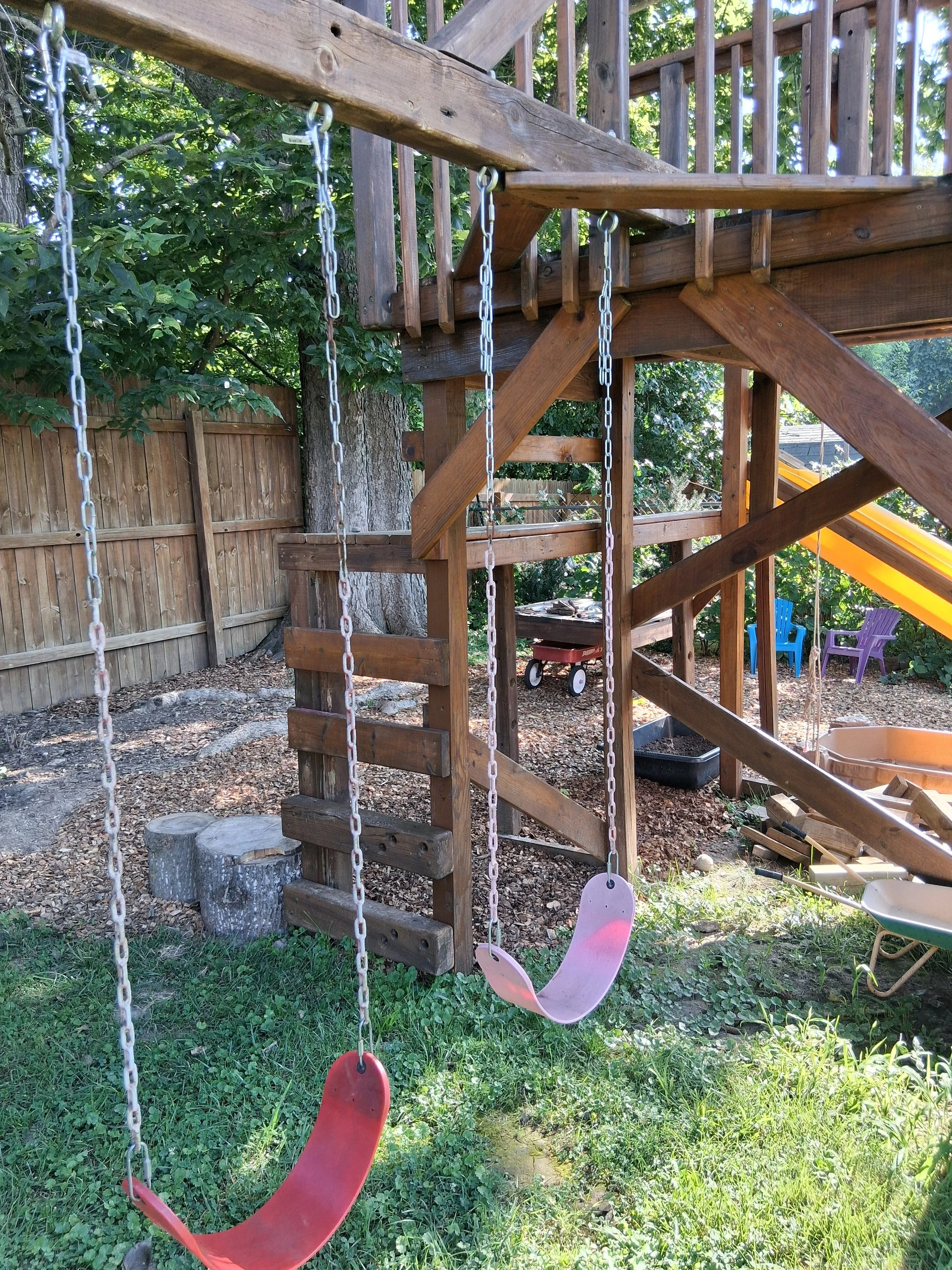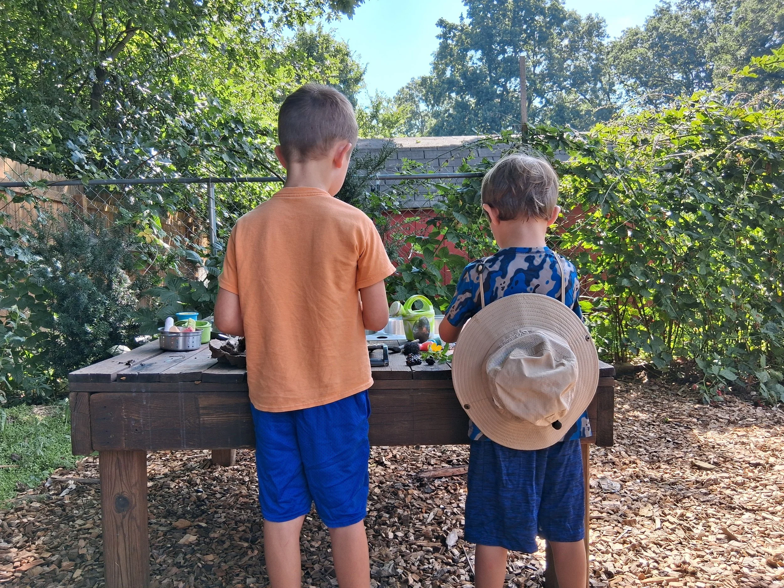 Blackberry Blossom Preschool is a mini-homestead that is located on a little less than an acre just minutes from Tri-North Middle School in Bloomington, Indiana. We are an outdoor preschool, which means that, with the exception of inclement weather, we are outside rain, shine, or snow. We have a playground, giant sand pit, mud kitchen, art/tinkering workspace, vegetable gardens, a pumpkin patch, dozens of fruit trees, chickens, (rabbits coming soon), open green space and loose parts, and of course, a huge blackberry patch. An indoor play space is available during dangerous weather. Click Gallery to view more photos of our lovely little oasis in the city.